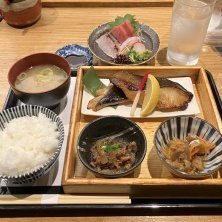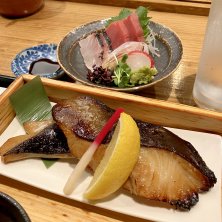 銀ダラみりん定食に 刺身3点盛りをプラス 脂がのった銀だらは6日漬け込んでるとのこと、しょっぱすぎず甘すぎずキュとした身が美味しかったですー マグロ中トロ/メジナの湯引き/メダイの炙りの刺身3点盛りも質が良くて美味美味