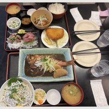 葉山ドライブ。下調べしたお店。想像したよりずっと凄かった。 まるわ定食、金目鯛の煮付けとしらす丼、 アジフライ、名物らしくサクサクふわふわ、マグロが分厚くて柔らか、美味しかった。 どちらも2000円 お値打ち。