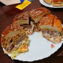 チーズバーガー、ベーコンチーズバーガー、テリヤキバーガー、ワカモレサルサバーガー♪ みんなで、わけわけして4種類食べた♪