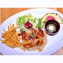 すかいらーくグループのハワイ料理のチェーン店、ラ・オハナのガーリックシュリンプ&ピラフ 照り焼きバターソース。オアフ島の北東部に有るノースショアのカフク地方の名物ロコフードであるガーリックシュリンプとガーリック風味のピラフにフライドポテト、レタス、照り焼きバターソースとパイナップルを添えた料理。自分はハワイ料理の中ではガーリックシュリンプが特に好きなんで、これを選んだ。量は余り多くなかったが、味自体は美味かったと思う。この料理の値段の殆どをすかいらーくの株主優待券の残高に使用した。