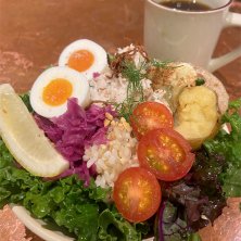 八ヶ岳湧水鱒のサラダボウル🥗 焼きたての鱒グリルとフライドエッグ、揚げたてポテトがトッピングされたサラダです✋ キヌアが入ってるので腹持ちも良いです☺️