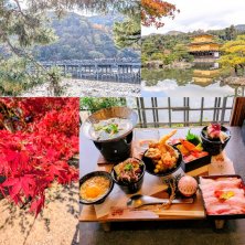 今日は嵐山へ 紅葉も見頃!ものすごい人... 小さい器に5種類の丼、食べ比べ 私は手前のたまご丼がすき♡ 美味しくいただきました