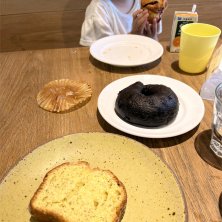 ランチ おやつのようなお昼ご飯ですが😂 レモン&ハーブパウンドケーキ、チョコベーグル、プラムマフィン と飲み物ー 娘と二人の外食の時は、すぐに「おしまい!」で帰るー!になることが多いので、がっつりごはんはなかなか勇気がなく😂それにしてもおやつ感 パウンドケーキ、美味! マフィンがすっごくふわふわーでした