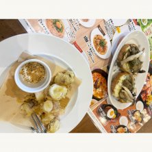 ヤリイカのフリット きのことハーブマリネポークのブルスケッタ