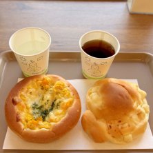 新開店限定の塩枝豆パンとハスカップフロマージュに無料サービスのホットコーヒー😋 明日から無料サービスが紅茶に変わるそうです😌