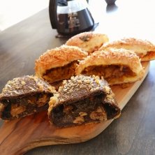 お昼はカレーパン3種 牛すじ黒カレー マサラカレー モッツァレラトマトカレー 軽くリベイクしてカリカリ チーズはとろりでした カレーパンの種類がたくさんあってめっちゃ迷いました