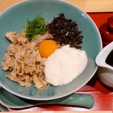 本日のランチ 十割 肉玉 とろろ まぜ蕎麦 1400円 気温のぐんぐん上がった本日🌞 冷たい蕎麦な気分で訪店。 文字のメニューだけみてピンとこないでいると写真のメニューを出された。 「"ぶっかけ"ですね」と返してみたが、 🤔まぜそばとぶっかけは違うものでは?と思うこと暫し。 ……ま、美味しかったから良いか😋