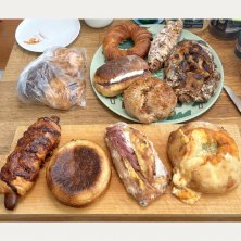 せっかく早起きしたから!と6時半に出て行ったオットーイーツ どこだ?と思ったら下田流だった (ケンかな?とも思ったんだけど) でっかい黒いのはピスタチオと何かのベーグルなんだけど半分にカットしたらフォンダンショコラ?!でチョコがとろり。悩んだけど冷えて固まるのを待つことに クロワッサンは黒っぽい方がノーマルで白っぽいほうがイズニーバター使用、スコーンはオレンジと紅茶、レーズンバター、コーンパン、コーンパンのジャンボンブール、細長いのが塩バターパン、あんバター、レーズンパン