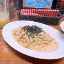 博多明太子カルボナーラ 卓上のガーリックオイルかけて食べると美味しい。この後長めの勉強会なのだけど、眠い…。