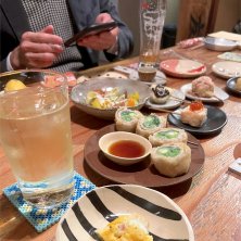 一次会 ◉九条ねぎの豚まき、サーモン、茄子の串 少し濃いめのハイボール 0次会が意外にも盛り上がり一次会に遅れそうにお店へ急いで向かっている京都河原町竹屋町西入 今回の心燃会は前に写っている男子が前に行った立ち飲みバルに行った時にメッセージをくれて、そこから新年会(心燃会)をしよかぁってなった 僕にとってそれを決めた日はまだ体調が良かったのやけど、その後悪くなってたので実は結構ドキドキものでした 少し事情を知ってる仲間やし甘えていたのもあるけど、いやぁ〜良かったぁ 少し自信でたぁ〜