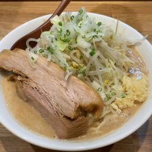 豚ラーメン900円にんにくあぶらシロ+濃厚魚介変更券50円★★★★☆ 大人気の零一弐三を畳んだ店主が暖簾や看板どころか屋号も掲げずに営む煮干しの名店。が、日曜日はガッツリ系とのことで、せめてもの足掻きに濃厚魚介テイストに。魚粉でもふりかけるのかな⁉︎と思いきやベジポタの如く濃密に作り込まれたスープは唯一無二‼︎ちばから謹製のもち肌麺との相性も良好ですた(๑•॒̀ ູ॒•́๑)