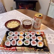 湖西への旅⑥ *三種花巻き寿司(980円) *お椀でどん兵衛🦊 *🍺 アサヒ生ビールワンサード スキーの後、外食ばかりもなんだし食べに行くのもしんどいので、帰りしなのスーパーでお寿司を買う ひとくちサイズで美味しい ご飯(お米)が食べたかったのよね〜