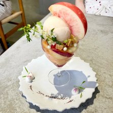 ❤︎パルフェバンビ フリュイセゾン ペシュ お友達が頼んだパフェ🍑 お誕生日だったので、メッセージを書いてもらいました◡̈♥︎