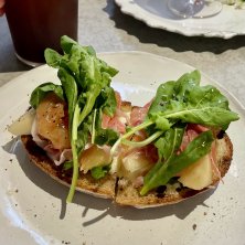 ❤︎桃のタルティーヌ ローストした桃、チーズ、バジル、ルッコラ お友達と半分こしたこちら、美味しすぎた…‼︎ 🍑🌿🧀