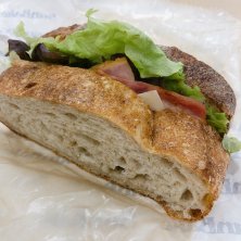 やっと!買えた! バゲットの切れ込みから巻き上がってるとこがもう美味しそう。 小麦の香り高いパンでした♪ お客が次から次へと来店してて、午後に行ってもないわけだね。 価格は高めだから、時々、って感じかな。 食パン食べてみたいな。