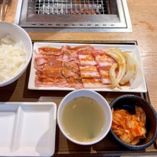 流行りの一人焼肉のお店へ。 これはカルビとハラミで合計200g。 ご飯・キムチ・スープ付いて1,500円切るなら悪くない(^-^) 女性のお一人様も沢山います。