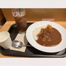 こんにちは☁️ 新宿で赤チャリ漕いで🚲 東新宿で赤チャリ返却ッ! ひと休み😮💨 ビーフカレー半額なので初利用! カレーマルシェですな🍛
