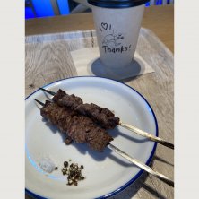 2022.4.15 おやつ 神戸ビーフの串焼き、カフェラテ、ジンジャエール。 予定が変更になったので散歩。神戸ポートミュージアムのフードコートに入ってみたら「肉食べたい👀✨」とのことで、アトアの水槽を見上げながら串焼き。 そういえばお昼にも肉うどん食べてた。今日は肉気分らしい。
