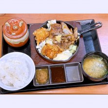 唐揚げのチェーン店、からやまの二種盛り定食。 大判焼き鳥が1枚分とからやま定番の唐揚げであるカリッとももが2個にキャベツを添えたおかずに御飯と味噌汁がセットになった定食です。イカの塩辛が付き、好きなだけ自由に食べられますが、自分は塩辛自体が好きではないのと、尿酸値が高い事から余り摂取しない様にしているので食べませんでした。焼き鳥は炭火で焼いた様な香ばしい感じを期待していましたが、タレは甘過ぎて焼き鳥というよりはまるでローストチキンを食べている感じでした。唐揚げの方は美味しかったです。