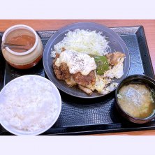 からやま定食(梅) から揚げはそこそこのボリュームで、 外はカラッと、中はジューシーな感じ。 肉汁?ぽたぽた垂れるときもあったかなと。 から揚げ自体には特段の味付けはされてなさそう。 つけだれは極だれがニンニクもきいてて美味しいかも。 味噌汁にはとろろ昆布が入っててGOOD 漬物も悪くない。 個人的にはこんなにたくさんツボで 出してくれる必要はないけど、塩辛もあり。