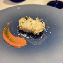 函館産 真鱈白子とバッカランマンテカートカダイフ包み アラビアータソース アジアゴチーズ カダイフ=薄いパスタ 細いパスタです。