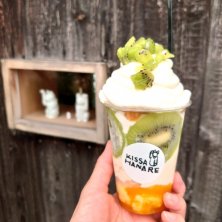 白桃パフェ 今回はカフェ利用の予約が取れなかったのでマフィンを買いに行ったら、パフェもテイクアウトできると聞いて注文😋 カップの中は、白桃コンポート、マスカルポーネクリーム、白桃ジュレ、自家製アイスクリーム、オーガニックコーンフレーク。