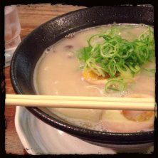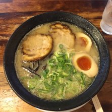 豚骨スープにストレート細麺、トッピングは半熟玉子と焼豚、キクラゲとシンプルな本場の博多ラーメン