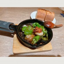 万願寺唐辛子と海老のアヒージョ 原了郭の黒七味と共に