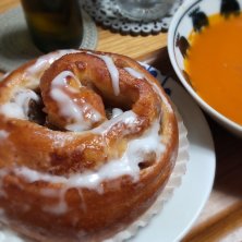 今夜の軽めの独り晩御飯 栗のブリオッシュ😋😋😋 人参のポタージュ ピクルス 梅酒 お野菜オンパレード🌰🥕🥒😁 あんバターよりアイシングのあったこっちの方が緊急🤭を要したのですぐ食べました😋