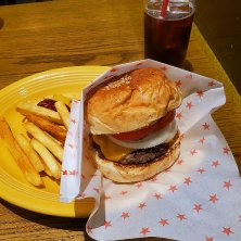 チーズバーガー 1260円くらい 俺はホットチリトマト、妻がチーズバーガーを注文したのに袋に✔︎されてたマークが逆になっていて、俺がチーズバーガーを食してしまった。 これ全然辛くないじゃん、と思いつつ完食した後に、妻が一口食べて「辛い!」と。正直裁判したら勝っちゃう事案だけど、味はいつも通り美味かったし今回は大目に見てやるか!