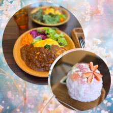 オムライス ・スパイシーキーマカレーソース ・自家製デミグラスソース かき氷 ・桜杏仁 2025/04/19 昼食