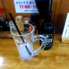お初のもつ焼き屋で黒ホッピー。 ここはシャリキンなのね