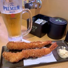 試合後は、行きつけの寿司屋へ 勝利の美酒とジャンボえびフライ タルタルをつけなくても海老自体の程よい塩味があり ビールによくあう🍻