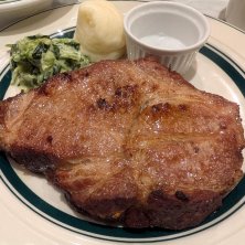富士山ポークステーキ(レギュラーセット)2090円 絶品のマッシュポテト&クリームスピナッチが添えられた焼成前450gの肉塊をライスとコンソメスープで掻っ込む!! 低温調理して揚げられた豚は外側カリッと中ジューシー、豊富な卓上調味料で味変も楽しく食べるエンタメですわーo(>◡<)o