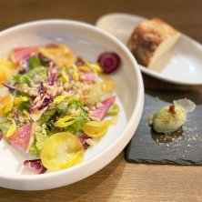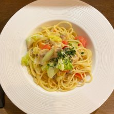 PASTA LUNCH@1,000円(税込) 15品目のチョップドサラダ、ピスタチオのフラン、自家製チーズフォカッチャ、アサリと春キャベツのオイルソーススパゲッティ めちゃくちゃ満足度の高いお店 ごちそうさまでした