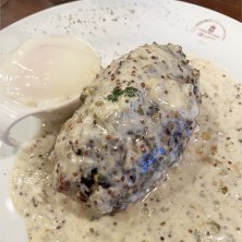 1週間くらい前にひとりで食べて来ました🐥 今、マツコの番組で登場してたので、嬉しくなって投稿しちゃいました❀︎.(*´◡︎`*)❀︎. 岩中豚100%です。柔らかく美味しい❣️ 私はモッツァレラハンバーグにマスタードクリームソースを注文😊 次はデミグラスソースをいただきたいです♪♪♪