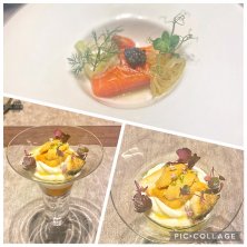 BDディナー② アミューズから始まり、その後は全6品のコース ・パフェのようなとうもろこしのムース 雲丹と鮑 ふわふわでした✨ ・富士山サーモン、キャビア 富士山のお水で育ったそうです 添えてあるのは、そうめん瓜