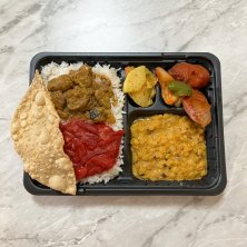 2022/04/27・お昼ごはん ○日替わりお弁当 500円 ・バスマティライス ・ダールカレー ・ポークカレー ・アチャール ・ナス甘辛炒め ・パパダン