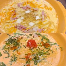 生パスタのお店で、7種のチーズクリームパスタ、いくらと大葉のクリームパスタ! どっちも美味しかったです。 生パスタは見た目量が少ないかなぁ?と思いましたが、意外と多かった。大盛りにしなくて良かったわ