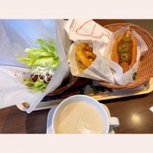朝飯はモスで菜摘ロースカツとスパチリの オニポテセットでクラムチャウダー