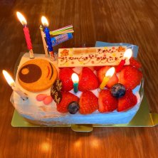 こどもの日&お誕生日パーティ🎂 鯉のぼりロールケーキ🎏 ロウソクとプレートを無理矢理差し込みました💦