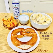 晩ご飯😃 プレッツェル🥨 オートミール豆乳粥🍌 ヨーグルト😋 さくらゆ♨️の柿😋 セイコーマートの北海道ミルク紅茶😋
