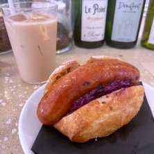 ホットドッグ🌭&アイスチャイ ソーセージはボリンボリン系だし、パンもリュスティック的な外バリ中モチ系だからバーガー袋を提供してもらえて助かった(絶対になしで綺麗に食べるの無理) スタッフの方おすすめのチャイがとってもスパイス効いててこれもまた美味しかったー✨