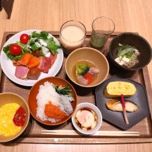 5日目朝食ダイニングにて うどん、海鮮丼どれも美味しい!