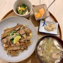 湯気さん すだちやかぼすを使ったごはんときいて またまた来てしまった 鶏ごぼうちらし すだちまたはかぼすの酢飯 具沢山のバターコーン味噌汁 湯豆腐 ニラオイル掛け しそ白菜 赤メロン