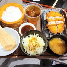 7つのフレーバーの内 2つを選べる "キムカツ膳ハーフ&ハーフ 65g×2"で (上)"チーズ"と(下)"梅しそ"をチョイス❤️ お膳には"おひつ"に入った "🍚炊き立てご飯"に"お味噌汁"に "🥬キャベツ"付き❤️
