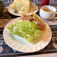 ランチセット ハーフナポリタン、ハーフタコス、スープ、サラダ、ドリンクのセット 存在を忘れてたぐらいの久しぶり😋 変わらず落ち着く、おいしい👏 ドリンクはいちごみるくをチョイスです♡