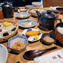 笠庵特製出汁茶漬けご膳 ・具材7種盛り合わせ 昆布の佃煮 鶏ごぼう味噌 辛子明太子 たまご焼き 帆立佃煮 海苔 山葵 梅干し ・伊勢真鯛のごまだれ和え ・鮭のハラス ・納豆 ・ご飯 あられ ・香の物 ・お出汁 2025/10/13 朝食