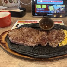 昼は肉くいたくなってステーキマン!🍖 レアで頼むと鉄板プレートをチンチンに熱しないで出てくる。 薄いから熱したら火が通っちゃうもんね。 しかしここのガーリック🧄スープは美味い。 ちょうど昼時で料理がなかなか出てこなかったのもあって3杯飲んでしまった(º﹃º )