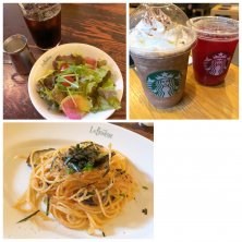 2022/06/23・ランチ ○辛子明太子パスタ(茄子トッピング) ○Cセット(サラダ/ドリンク) ・スターバックスコーヒー 自由が丘店 ○ダークモカクリームフラペチーノ